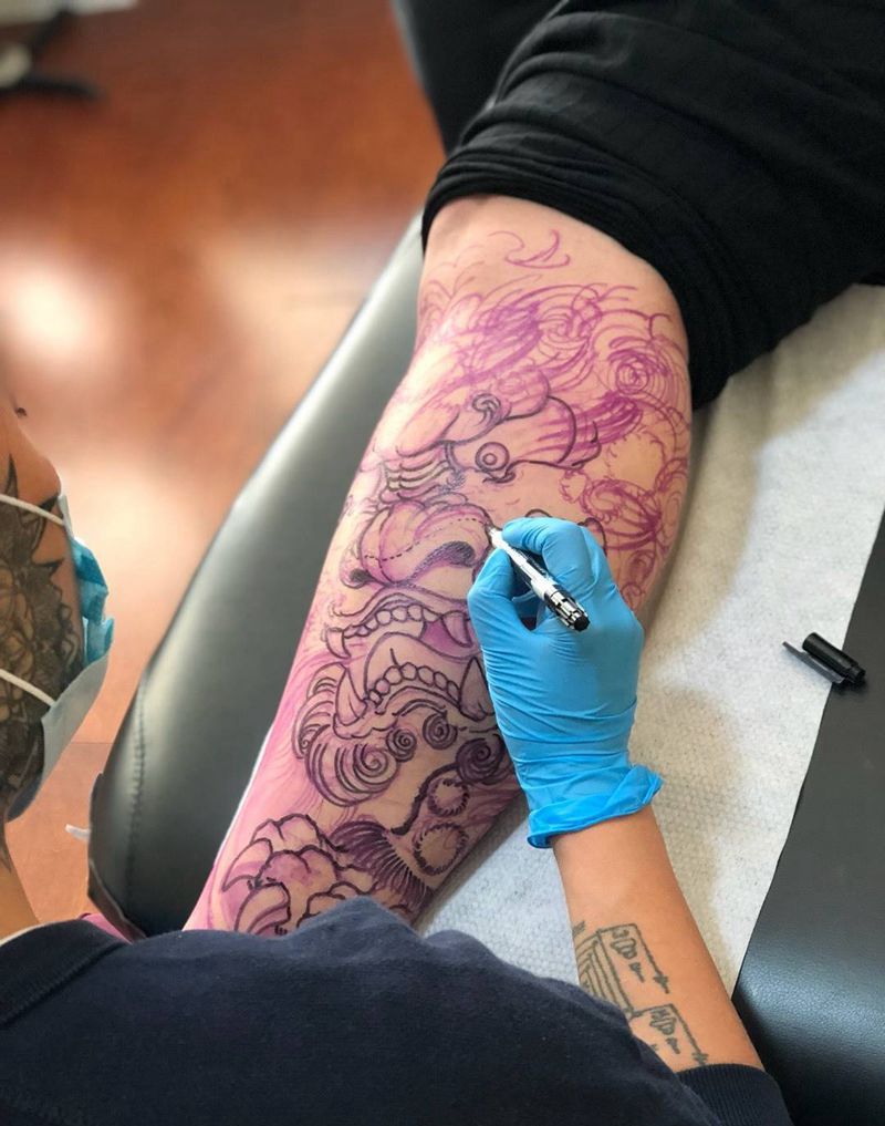 • T网红王老大花腿龙纹身图片_腿部新传统纹身图案