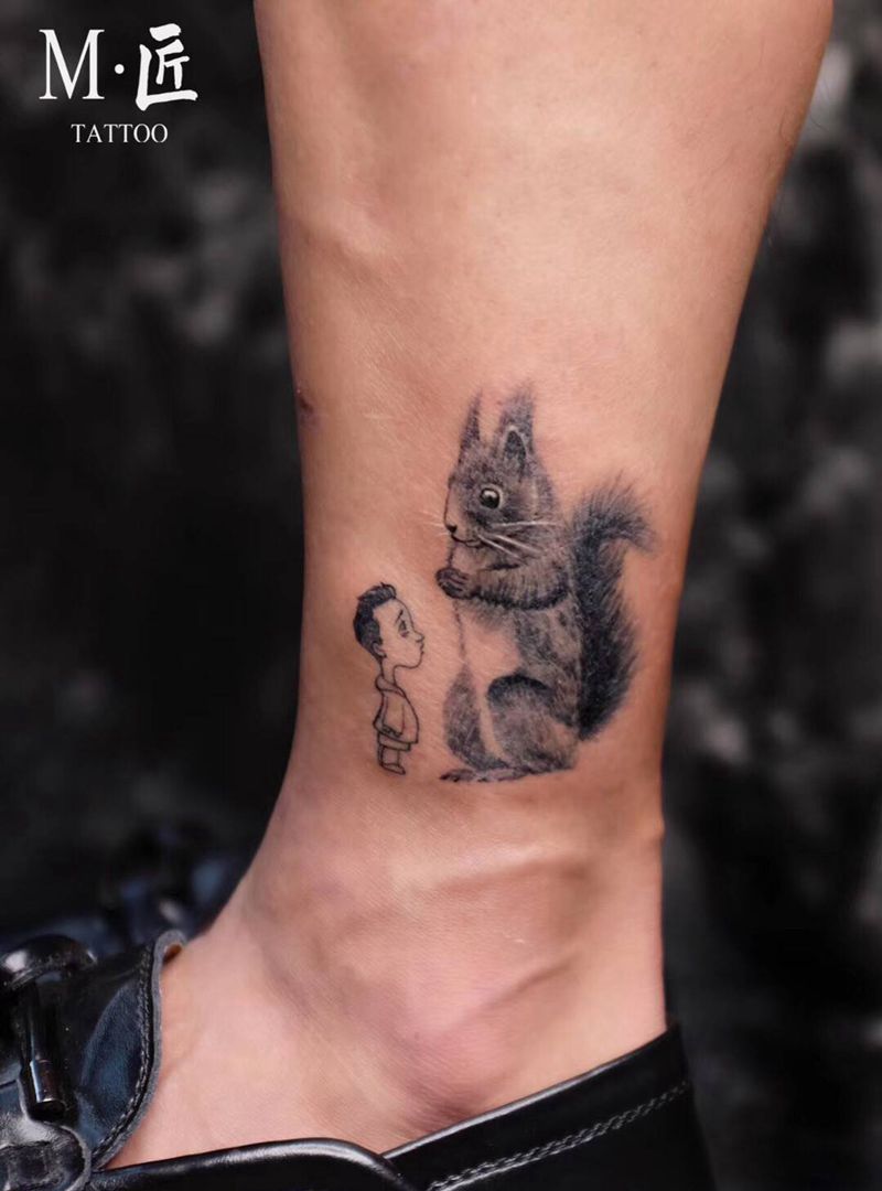 当前位置: 首页 >北京市纹身店-M·匠刺青坊纹身图案>松鼠与男孩纹身图片_腿部New School欧美写实黑灰写实纹身图案