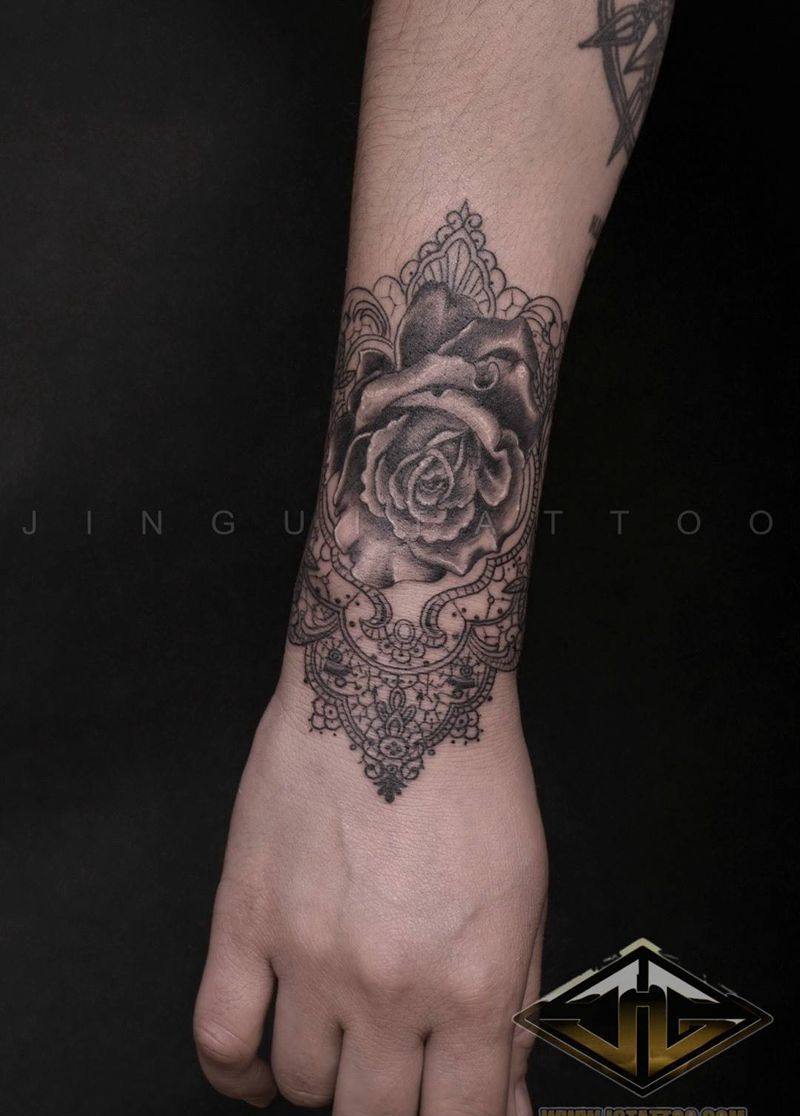• 手背潮流时尚的玫瑰花眼睛纹身图案