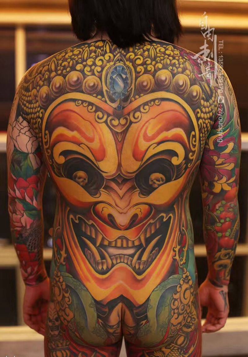 当前位置: 首页 >北京市纹身店-北京自由刺青纹身店纹身图案>满背面具纹身作品纹身图片_成品背部传统鬼神原创纹身图案