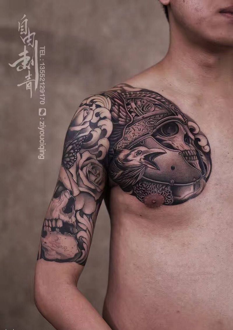 骷髅半甲纹身纹身图片_成品手臂胸部欧美传统人物鬼神宗教纹身图案