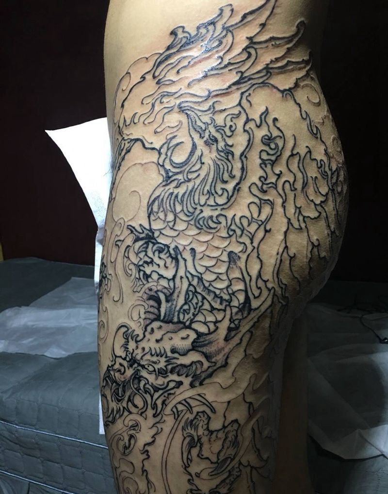 • T网红王老大花腿龙纹身图片_腿部新传统纹身图案