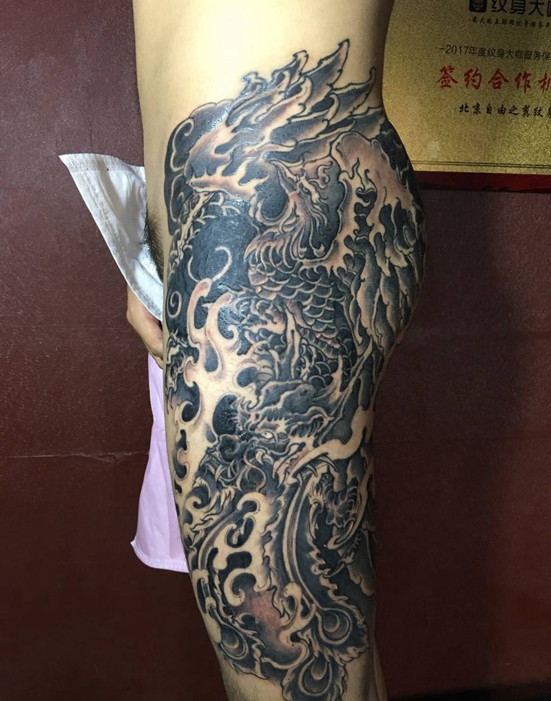 • T网红王老大花腿龙纹身图片_腿部新传统纹身图案