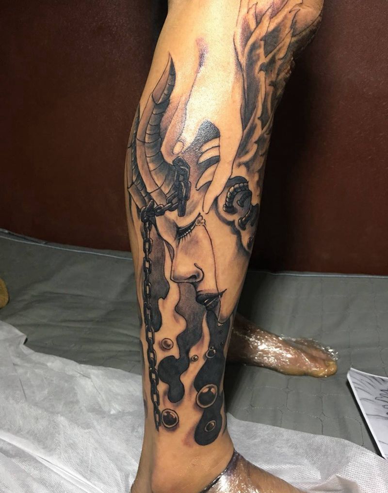 • T网红王老大花腿龙纹身图片_腿部新传统纹身图案