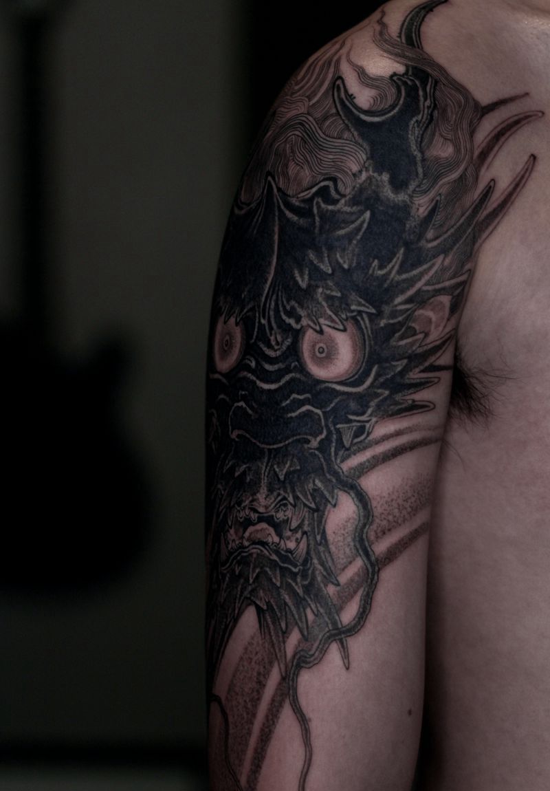 当前位置: 首页 >北京市纹身店-千贺宗纹身图案>龍首纹身图片_手臂肩部新传统水墨龍纹身图案