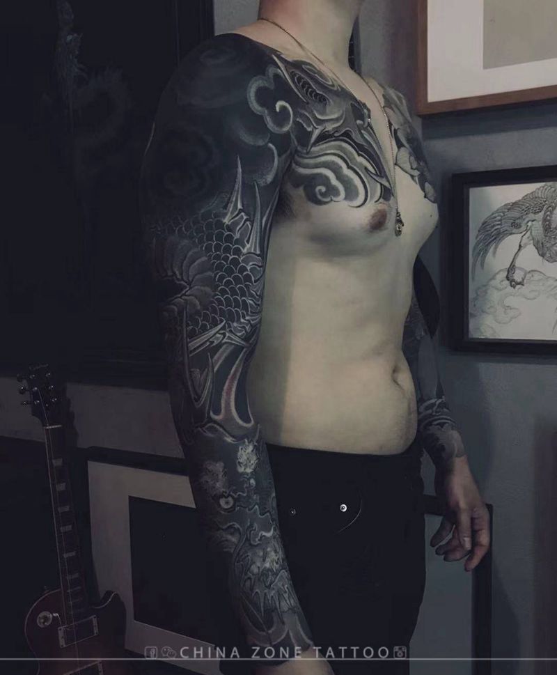 当前位置: 首页 >北京市纹身店-千贺宗纹身图案>王位作品纹身图片_胸部手臂新传统水墨龍纹身图案
