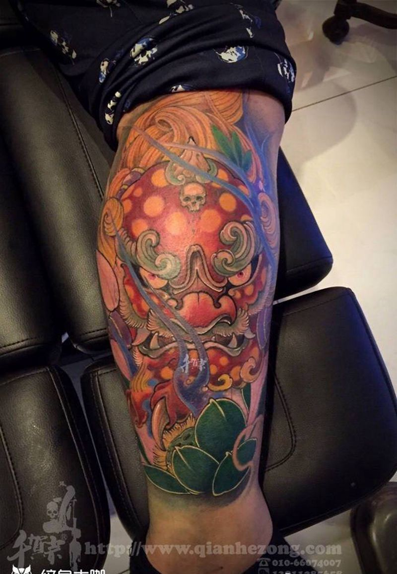 当前位置: 首页 >北京市纹身店-千贺宗纹身图案>唐狮子 包小腿纹身图片_成品腿部传统国画动物原创纹身图案