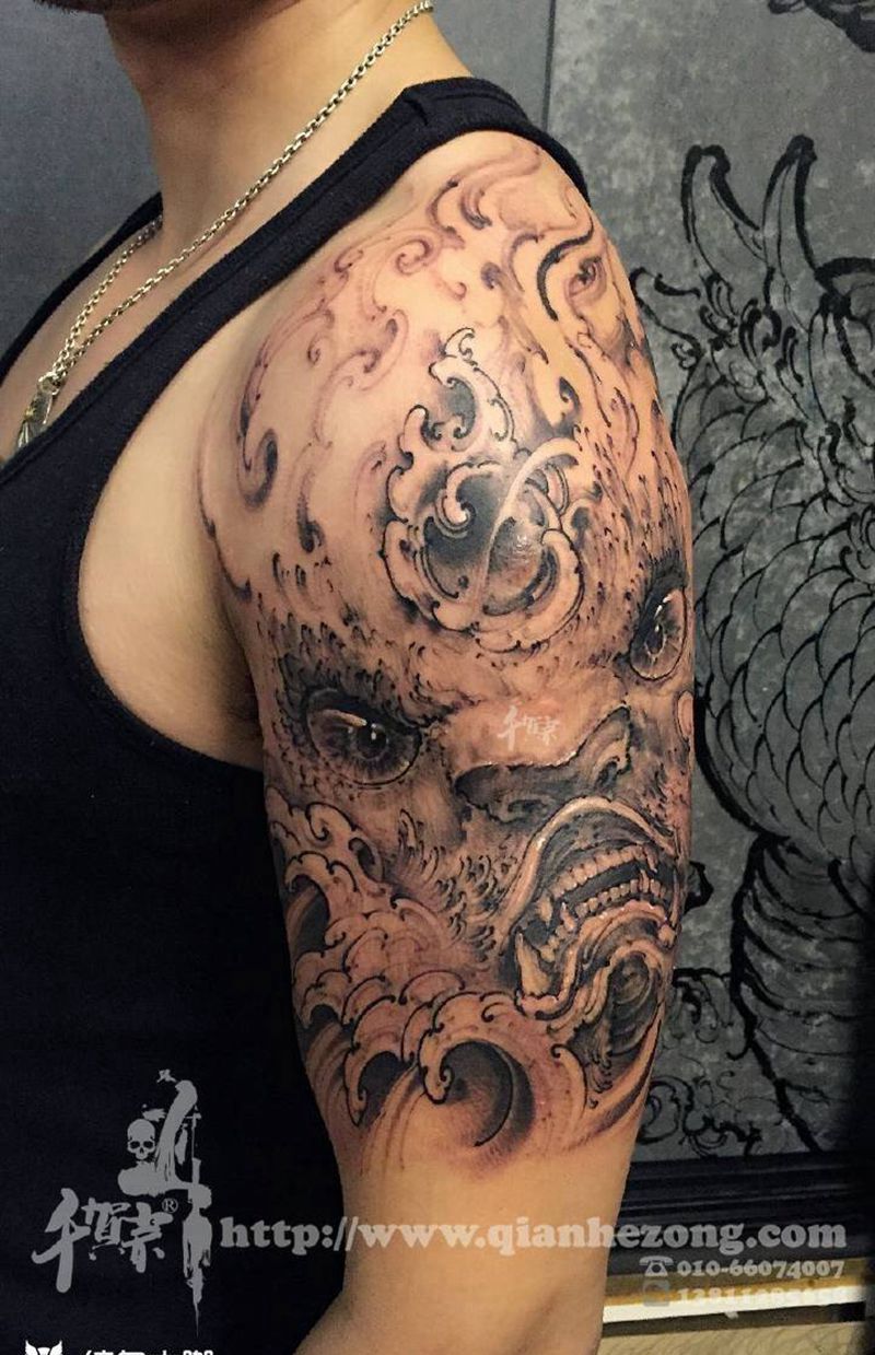 唐狮子纹身图片_欧美传统国画写实成品肩部鬼神动物原创纹身图案