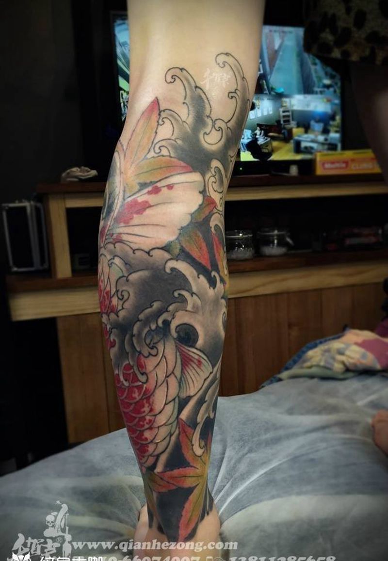 锦鲤纹身图片_手稿插画成品腿部传统习俗欧美原创国画动物纹身图案