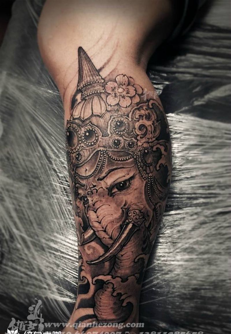 象神包小腿纹身图片_成品腿部传统人物鬼神欧美肖像写实国画纹身图案