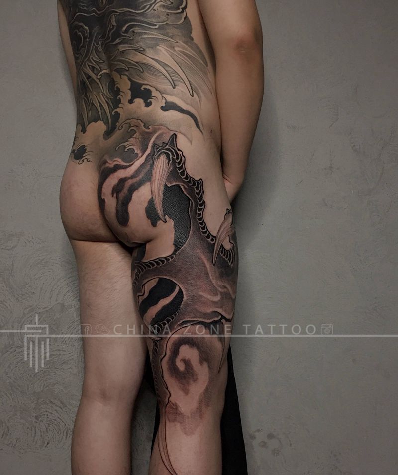 当前位置: 首页 >北京市纹身店-千贺宗纹身图案>王位作品 整背衔接纹身图片_背部腿部新传统水墨龍纹身图案