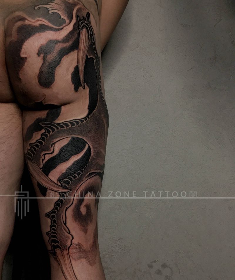 • T网红王老大花腿龙纹身图片_腿部新传统纹身图案