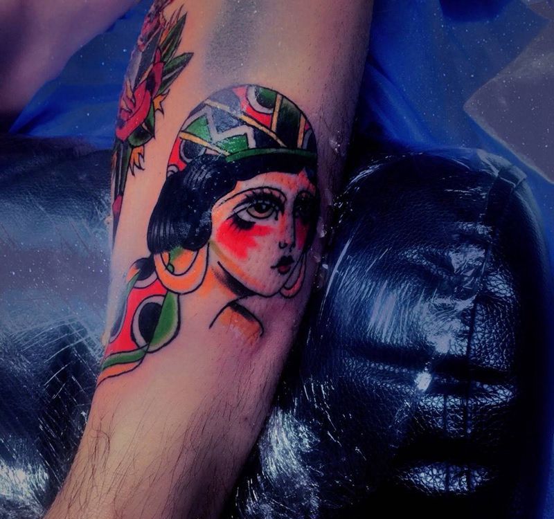• T包小腿吹火男+阿多福纹身图片_腿部老传统新传统吹火男阿
