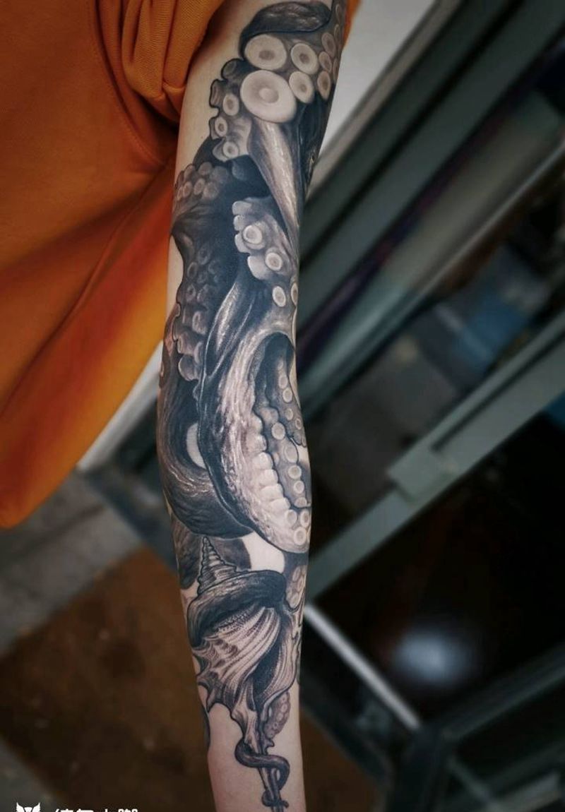 当前位置: 首页 >北京市纹身店-诡异空间文身艺术工作室纹身图案>这回的章鱼是黑灰纹身图片_手臂欧美写实纹身图案