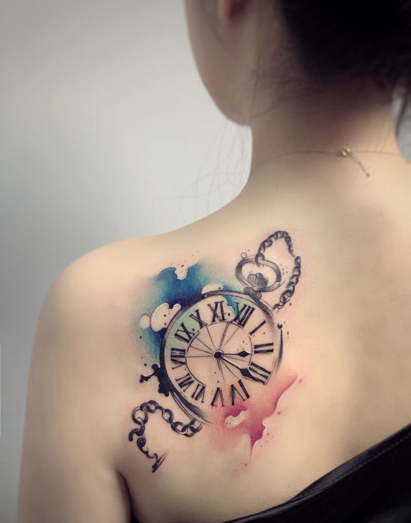 水彩时钟纹身图片_肩部背部水墨水彩水彩后背纹身纹身图案