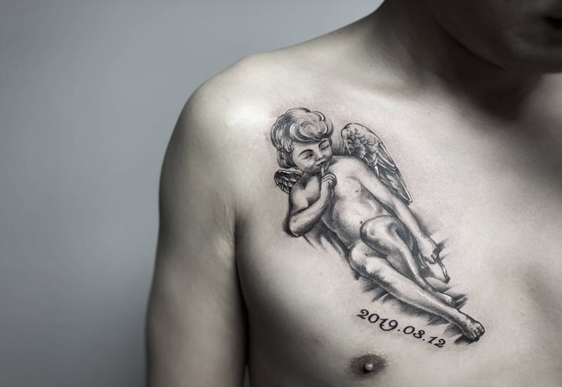 天使宝宝纹身图片_胸部欧美写实点刺纹身图案