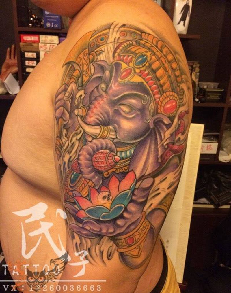 当前位置: 首页 >北京市纹身店-北京民子刺青纹身图案>彩色象神完成……纹身图片_
