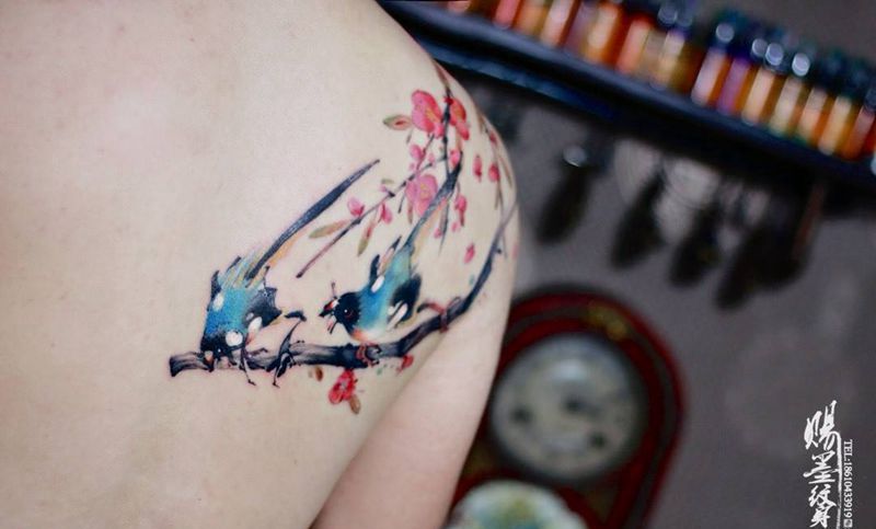 当前位置: 首页 >北京市纹身店-北京赐墨纹身纹身图案>樱花鸟纹身图片_水彩纹身图案