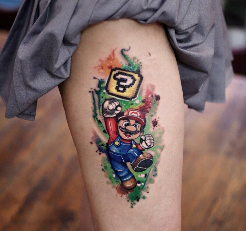 当前位置: 首页 >北京市纹身店-北京赐墨纹身纹身图案>超级玛丽纹身图片_腰部腿部水墨水彩赐墨纹身纹身图案