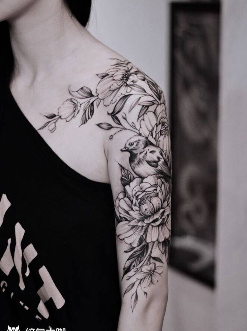 花鸟纹身图片_胸部肩部水墨点刺花鸟纹身图案