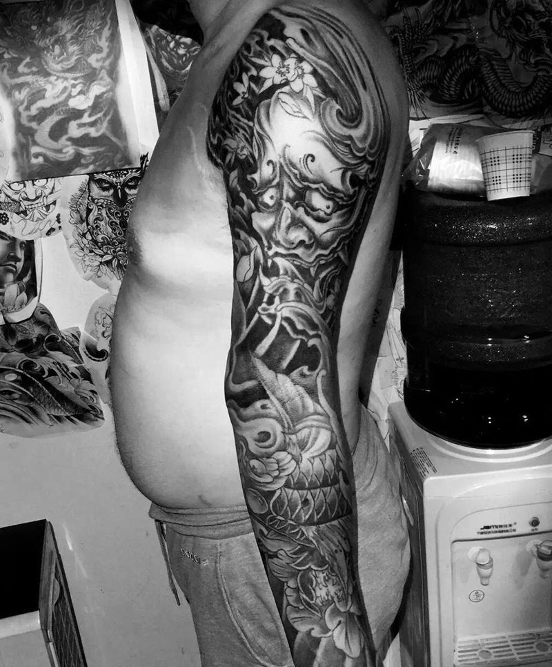 当前位置: 首页 >北京市纹身店-北京花刺纹身工作室纹身图案>传统黑灰花臂完成纹身图片_