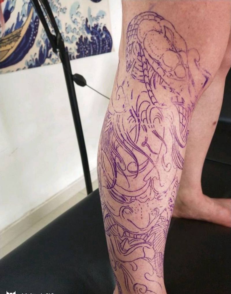 • T网红王老大花腿龙纹身图片_腿部新传统纹身图案
