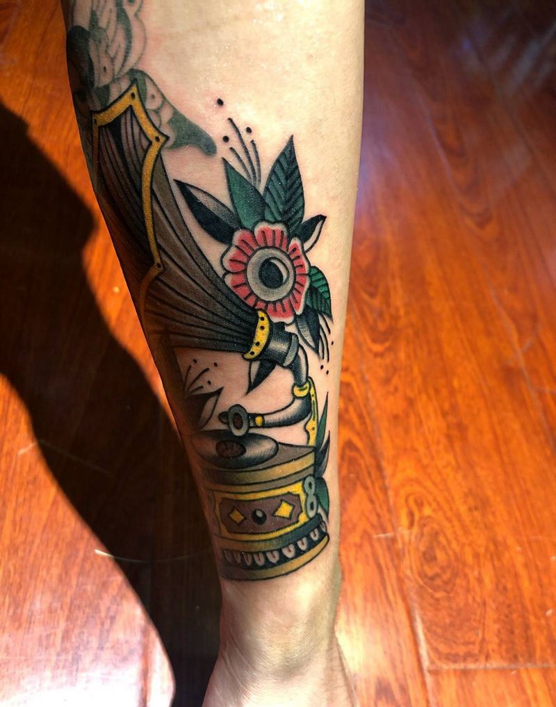 当前位置: 首页 >北京市纹身店-万相TATTOO纹身图案>留声机纹身图片_手臂Old School留声机美式纹身图案