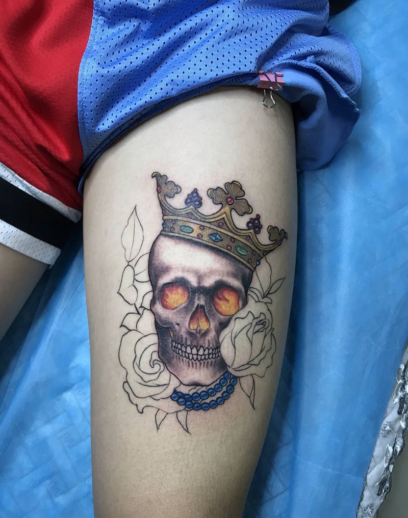 当前位置: 首页 >北京市纹身店-北京天下刺青工作室纹身图案>皇冠骷髅纹身纹身图片_腿部欧美写实骷髅纹身皇冠纹身纹身图案