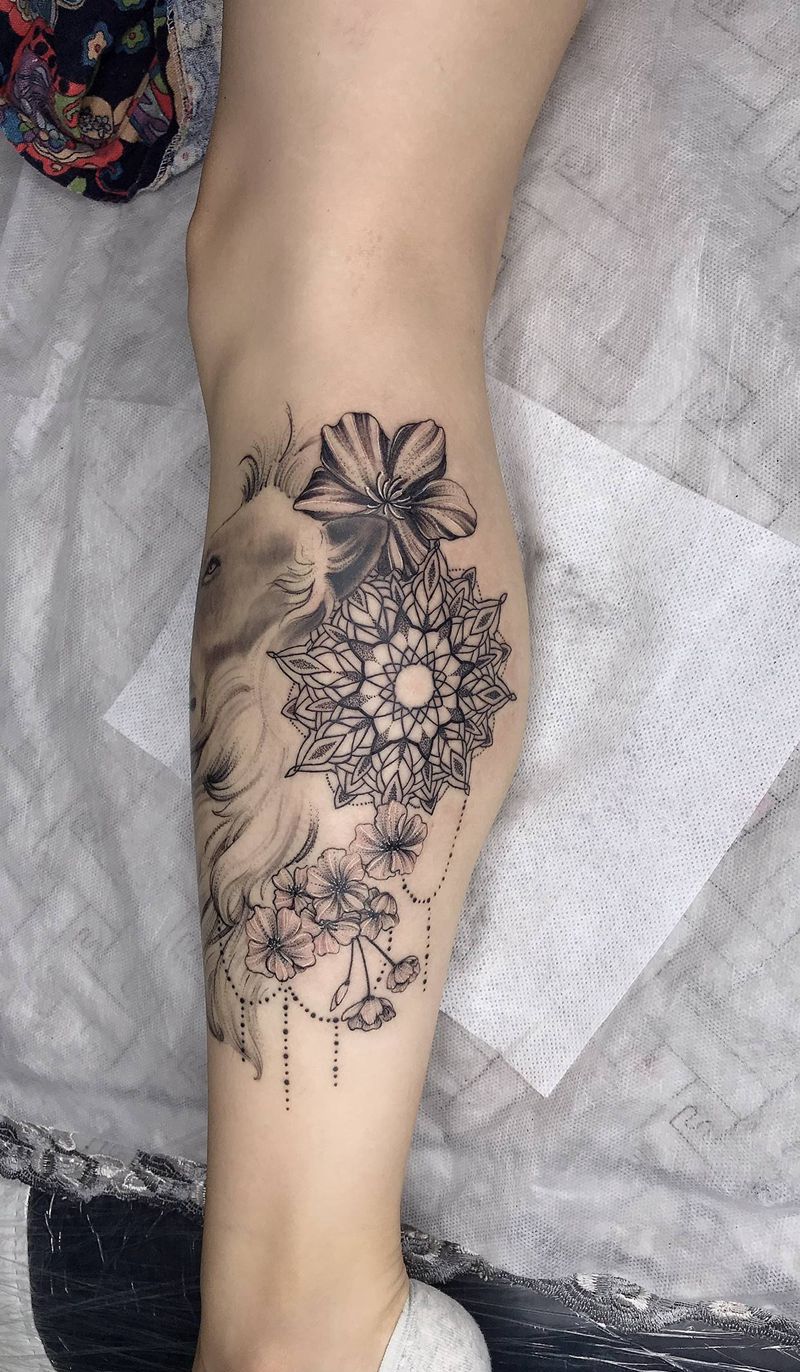 蕾丝花狮子纹身图片_腿部点刺几何狮子纹身蕾丝纹身纹身图案