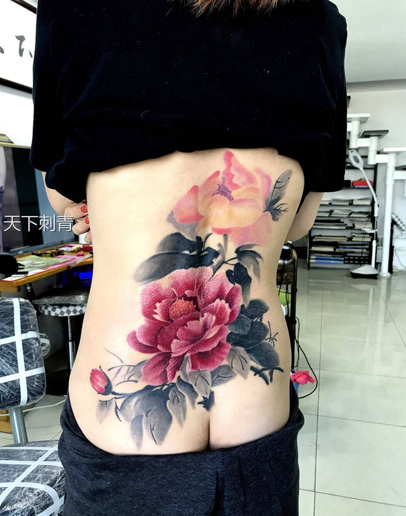 国画牡丹遮盖纹身纹身图片_背部腰部水墨国画牡丹纹身图案