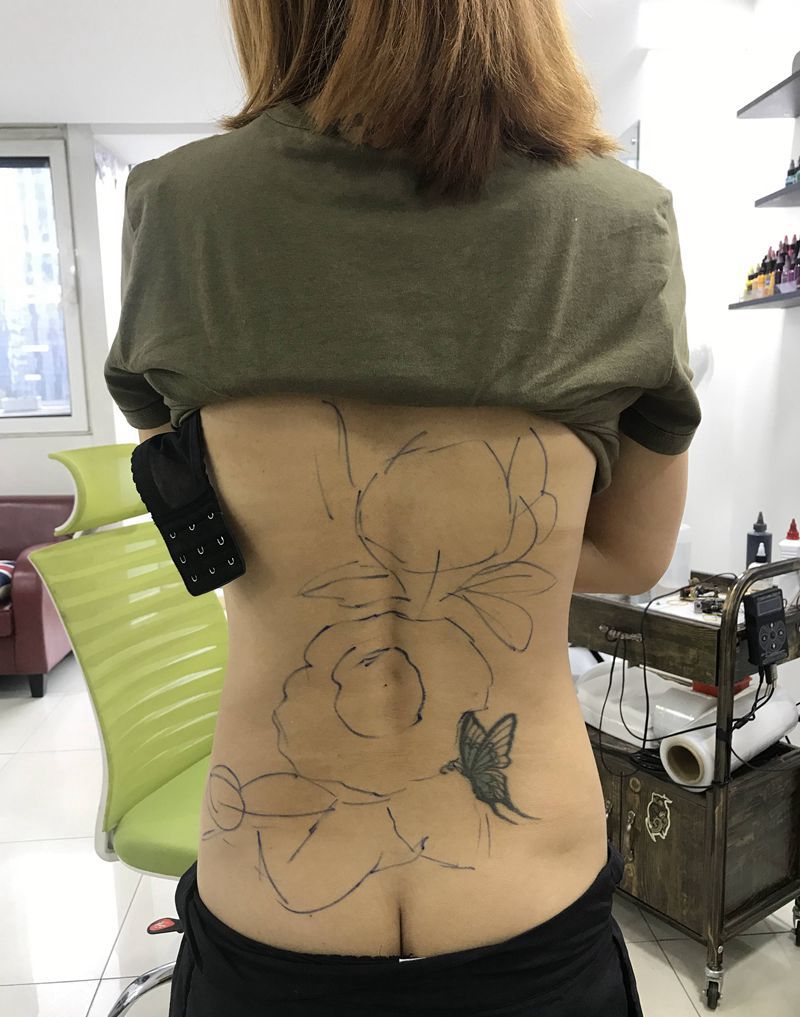 国画牡丹遮盖纹身纹身图片_背部腰部水墨国画牡丹纹身图案