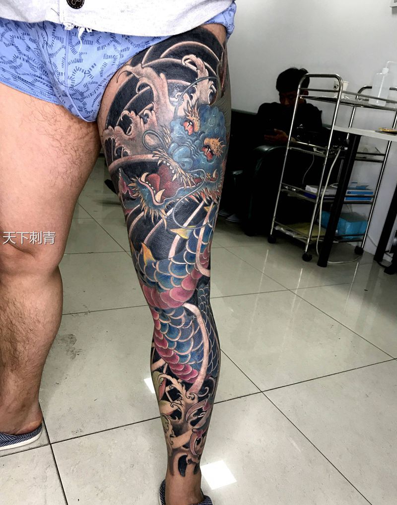 • T网红王老大花腿龙纹身图片_腿部新传统纹身图案