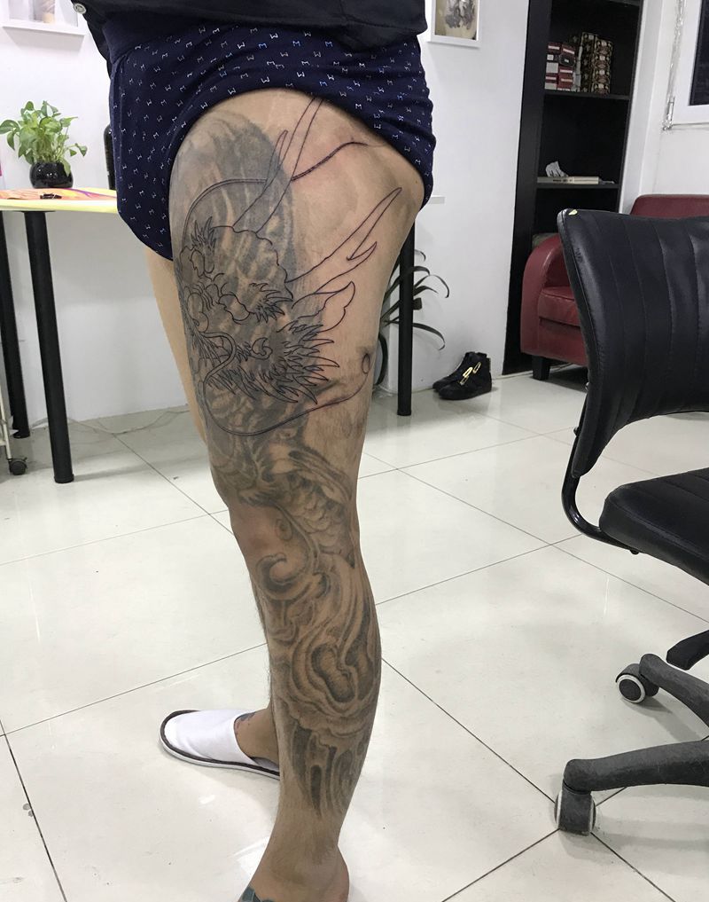 • T网红王老大花腿龙纹身图片_腿部新传统纹身图案