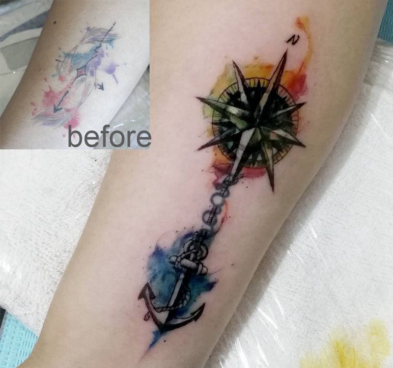 当前位置: 首页 >北京市纹身店-空间•ART•TATTOO STUDIO纹身图案>水彩指南针遮盖纹身图片_手臂水彩纹身图案