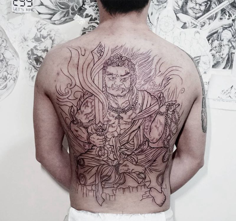 满背明王线条纹身图片_背部新传统不动明王纹身图案