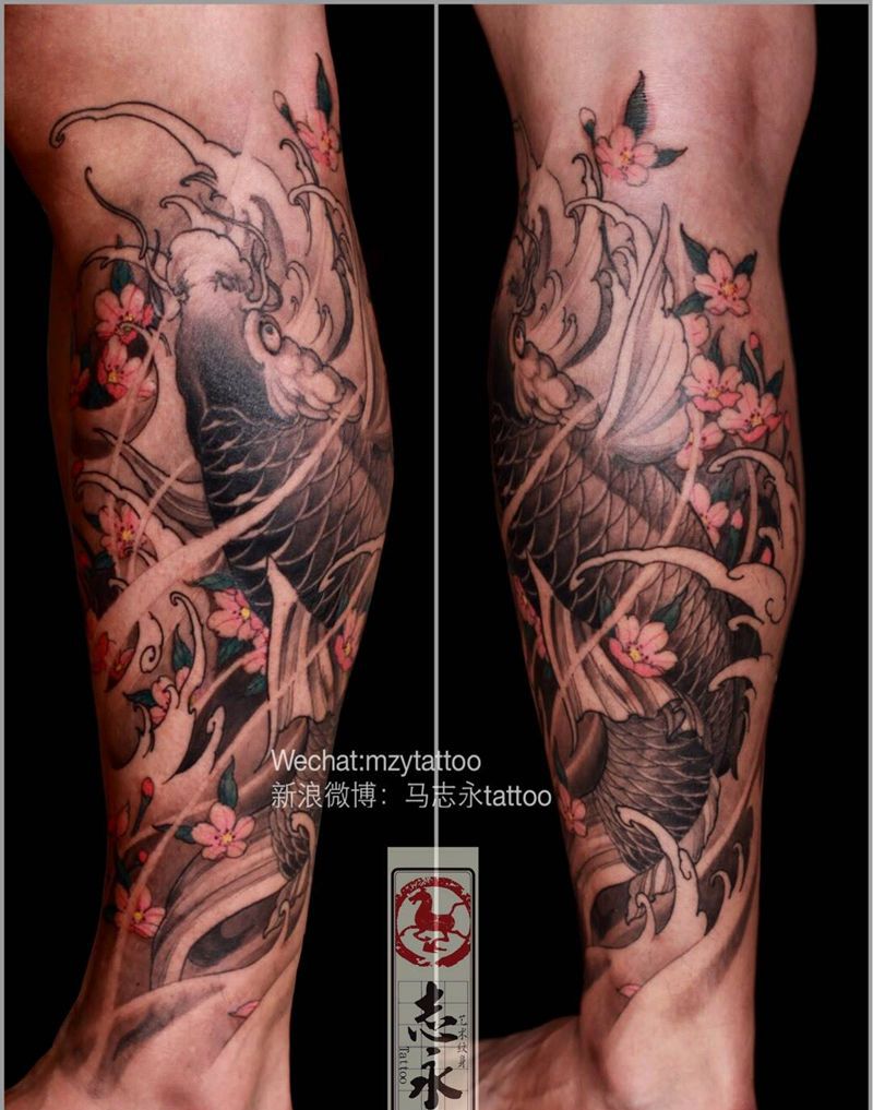 志永刺青原创樱花鲤鱼纹身图片_成品腿部传统动物北京纹身 志永刺青原创纹身文身纹身图案