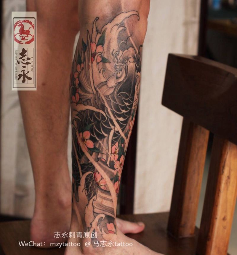 志永刺青原创鲤鱼樱花纹身图片_成品腿部传统志永刺青北京纹身 纹身文身原创纹身图案