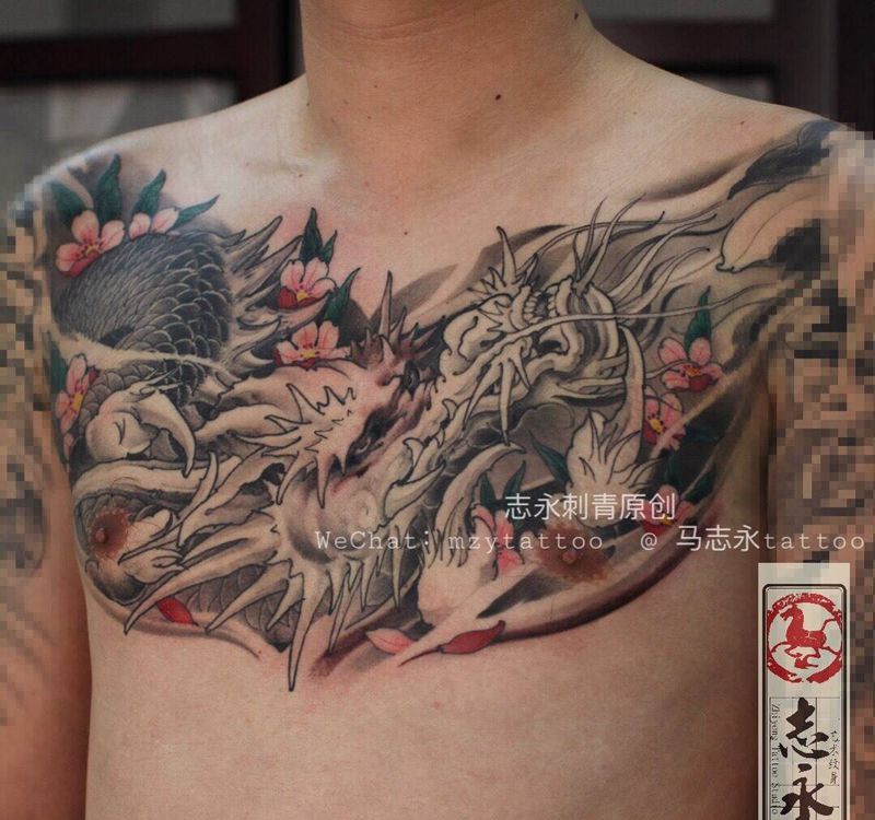 志永刺青原创胸口龙樱花纹身图片_成品胸部传统纹身志永刺青北京纹身 文身原创纹身图案