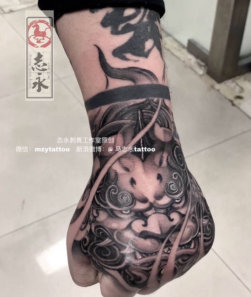 志永刺青工作室原创纹身图片_手部新传统志永刺青北京纹身唐狮纹身图案