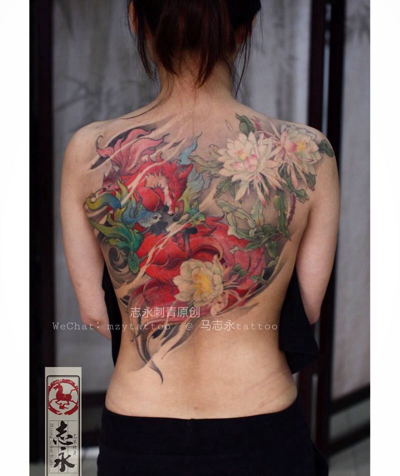 志永刺青原创狐狸金鱼纹身图片_成品背部传统原创纹身志永刺青文身北京纹身 动物纹身图案