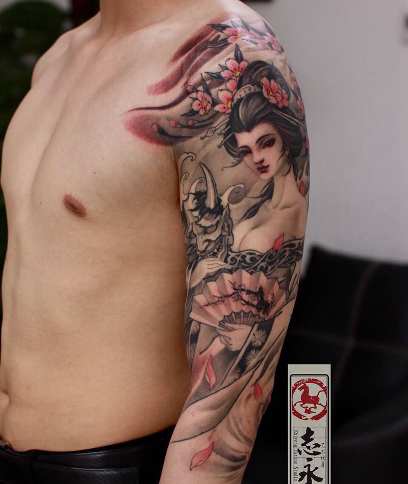 志永刺青原创艺伎纹身图片_手臂新传统艺伎纹身图案