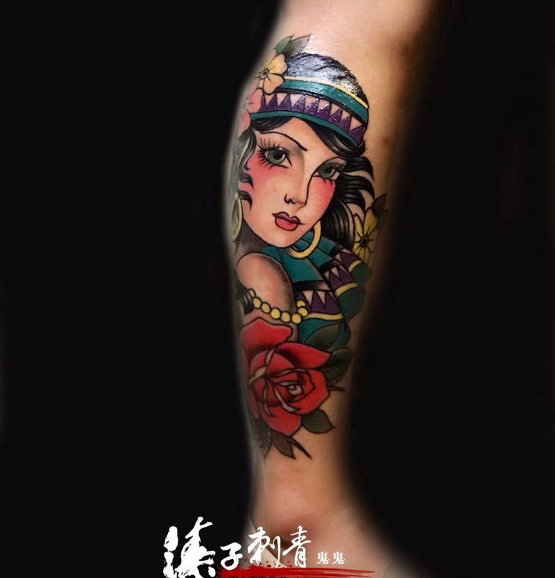• T包小腿吹火男+阿多福纹身图片_腿部老传统新传统吹火男阿