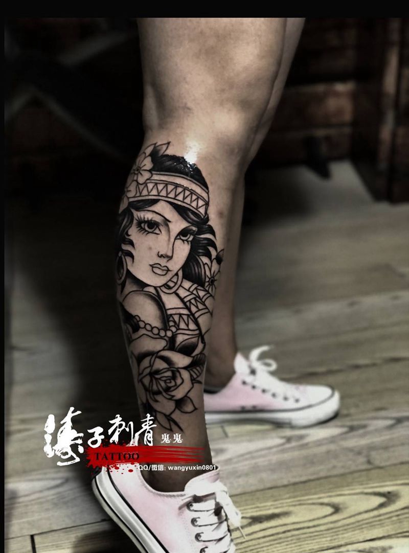 • T包小腿吹火男+阿多福纹身图片_腿部老传统新传统吹火男阿