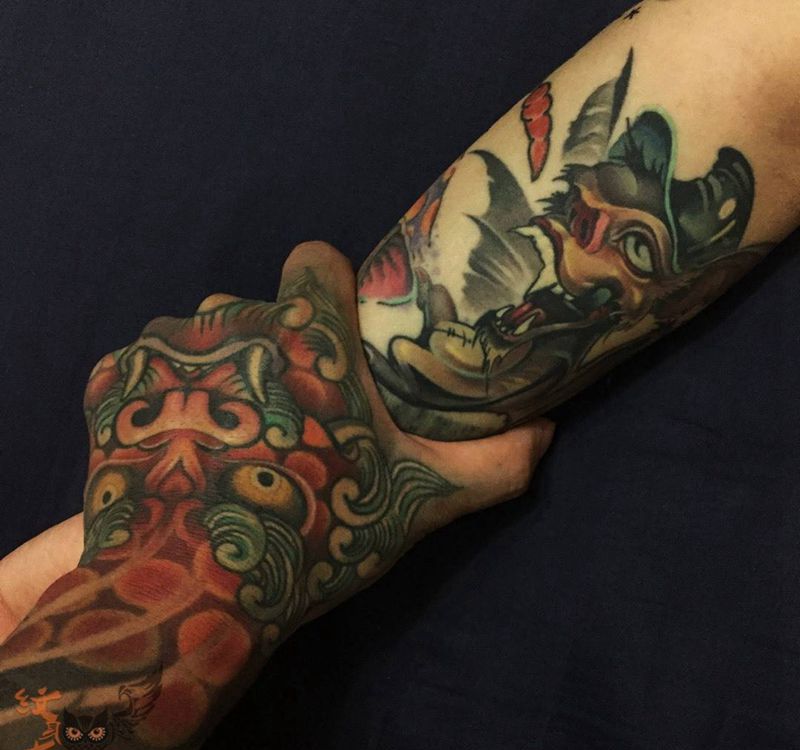 当前位置: 首页 >北京市纹身店-魔杰tattoo纹身图案>唐狮与蝙蝠纹身图片_