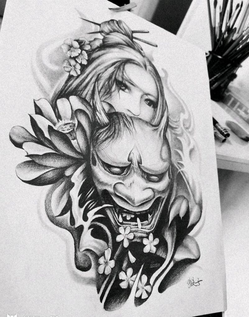 画个艺妓般若手稿纹身图片_新传统艺妓般若纹身图案