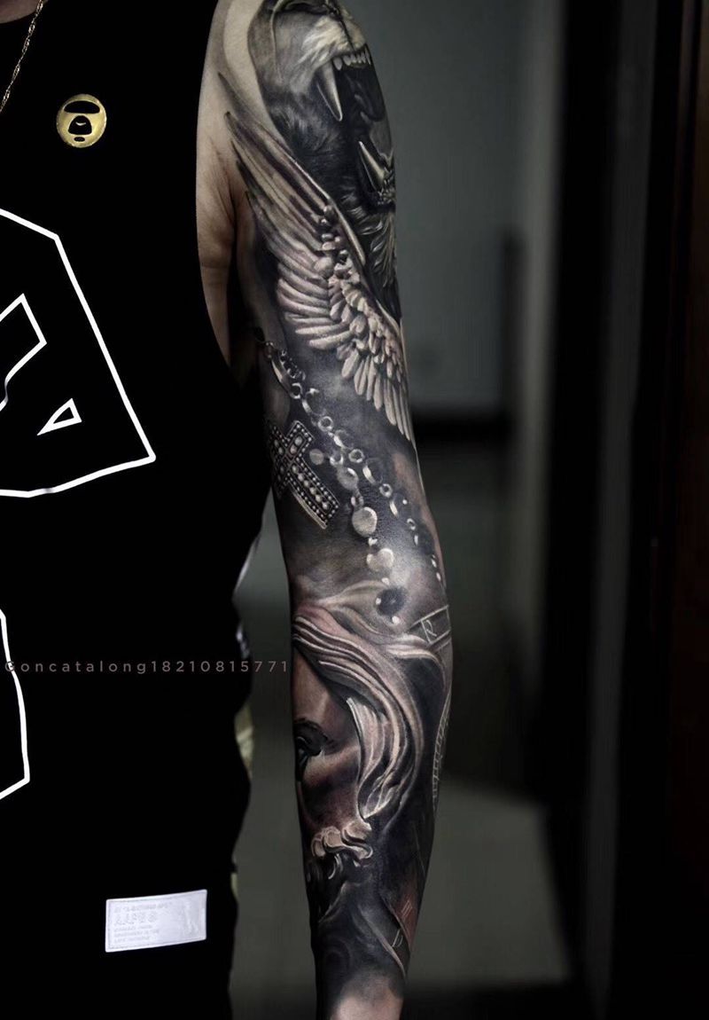 黑灰写实花臂纹身图片_手臂欧美写实雕塑纹身图案