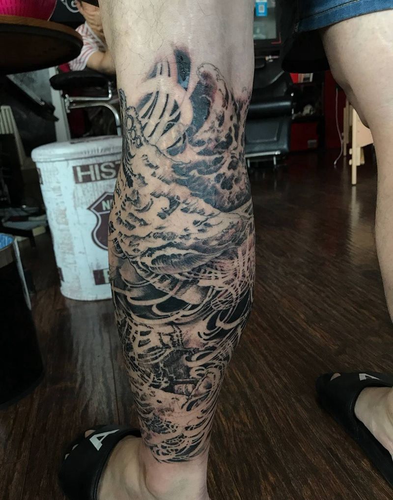 • T网红王老大花腿龙纹身图片_腿部新传统纹身图案