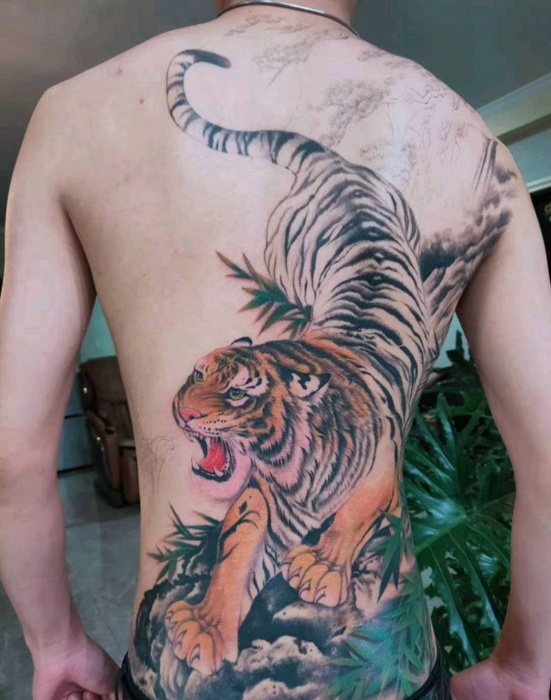 满背下山虎进度纹身图片_背部新传统虎,满背纹身图案