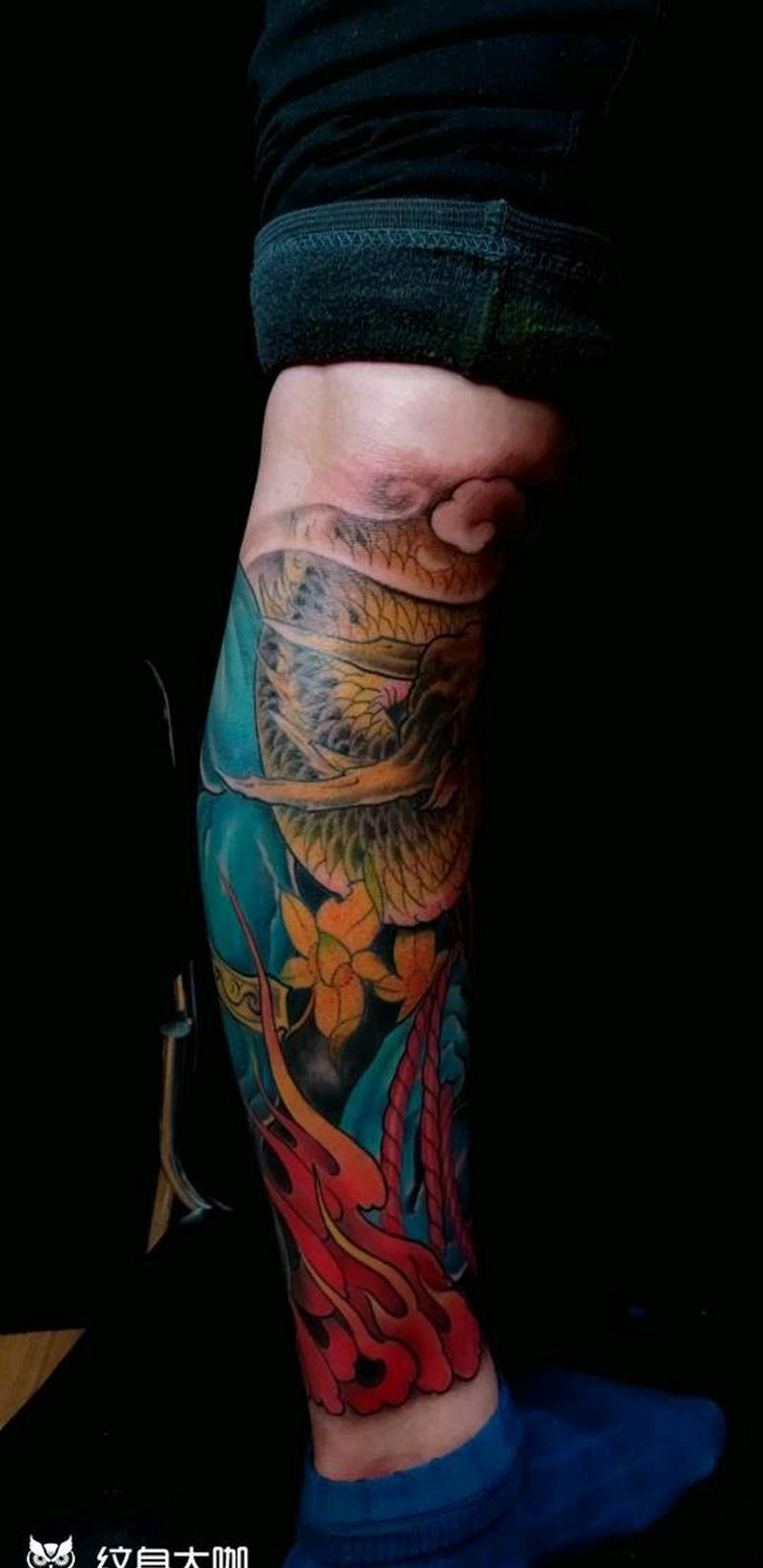 • T网红王老大花腿龙纹身图片_腿部新传统纹身图案