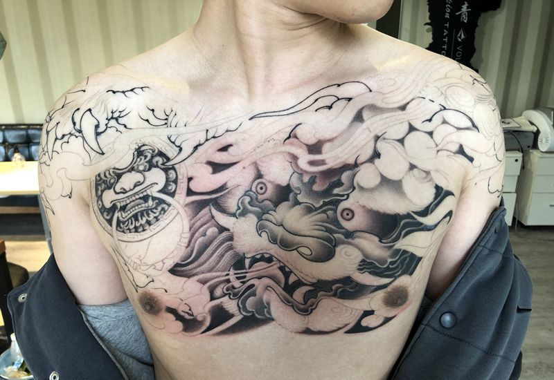 唐狮花胸未完成纹身图片_胸部纹身图案